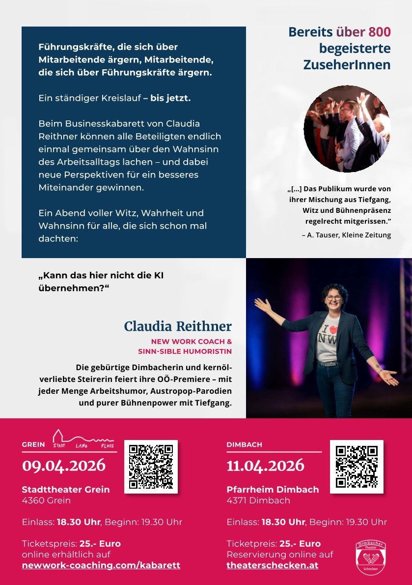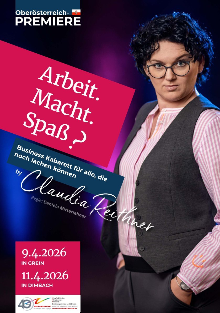 Claudia Reithner, aus Dimbach, mittlerweile schon seit vielen Jahren in Graz zu Hause gibt mit ihrem Kabarett ihr Debüt. Freut euch auf einen humorvollen Abend und blickt mit ihr in die "eigenarten" des Buiness.